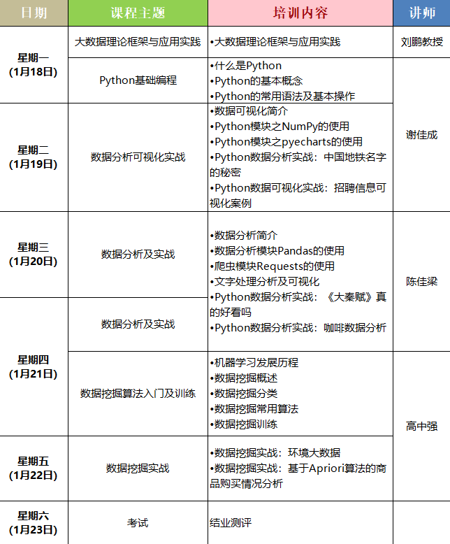 通过基础学习与在线实战,针对想要提升大数据教学科研能力的高校老师。同时,欢迎高校学生、企事业单位相关专业人员报名参加。