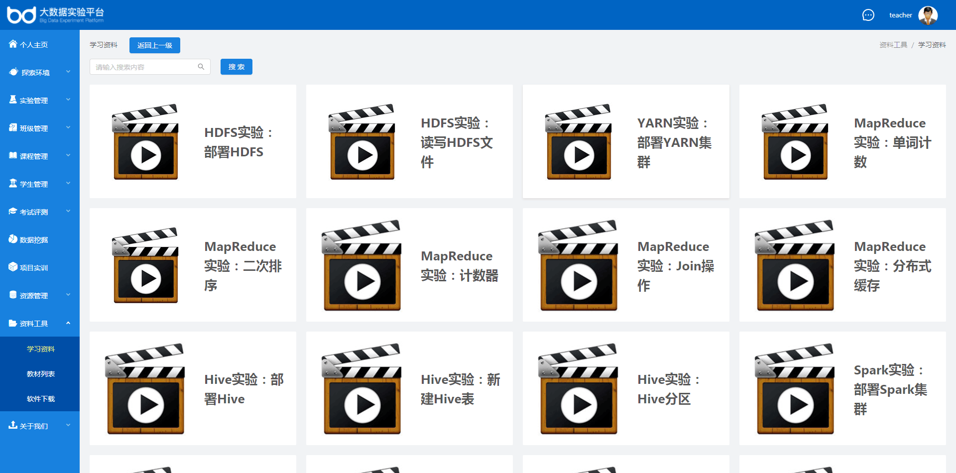 针对全国大数据专业人才的培养,云创BDRack大数据实验平台(目前实验总数为424个)基于Docker容器技术,一键创建实验环境,支持多人同时在线,实验相互隔离、互不干扰,集成考试系统(包括试题库)与数据可视化应用,同步提供详实的实验手册、实验视频、教学课件等资源,更好地满足课程设计、课程上机实验、实习实训、科研训练等需求。