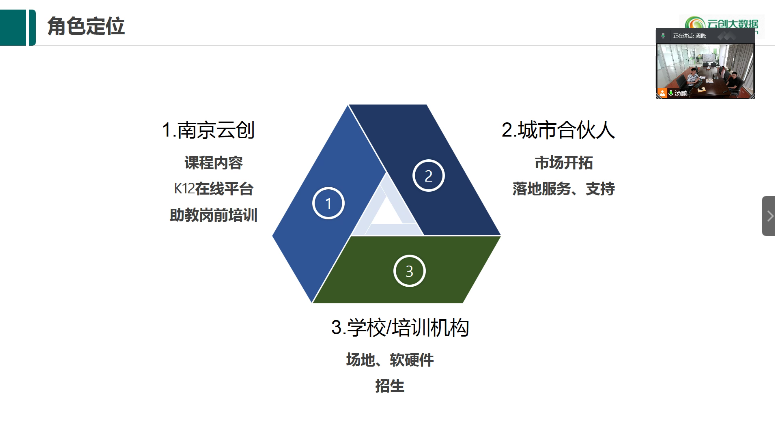 稍后,汤鹏经理带来了云创青少年人工智能编程城市合伙人合作政策及商务模式方面的介绍,并围绕“角色定位”、“目标市场”、“产品定价”等方面带来了详尽分享。汤鹏经理提及,进校共建课堂、进校社团课、机构常规班以及机构等级测评课都是城市合伙人的目标市场所在。